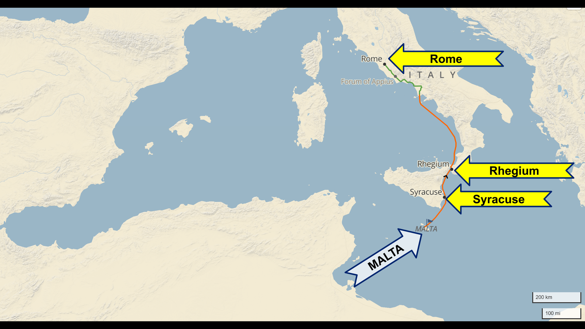 You can see on the map where Syracuse is on the southeast corner of Sicily. Here’s Paul’s journey from Malta all the way north to Rome.