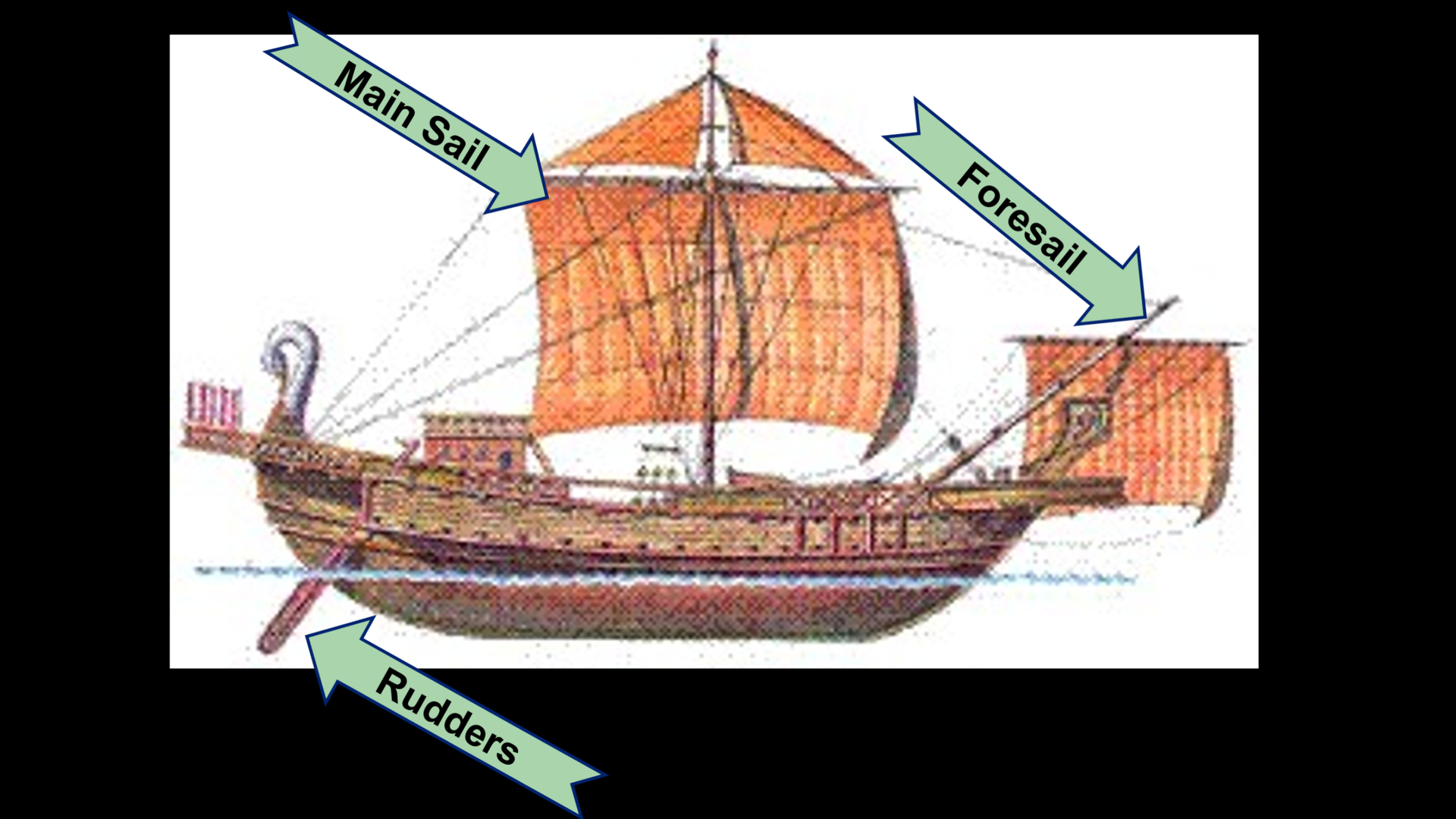Here’s a picture of a typical boat in this Roman era and you can see here the foresail, the rudders, and the mainsail.