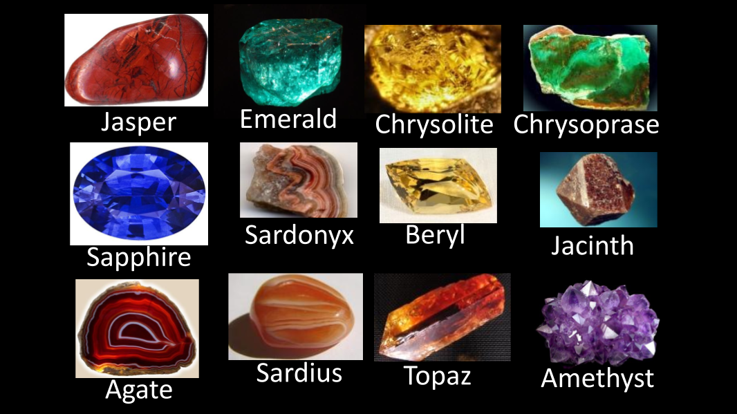 18 The wall was built of jasper, while the city was pure gold, like clear glass. 19 The foundations of the wall of the city were adorned with every kind of jewel. The first was jasper, the second sapphire, the third agate, the fourth emerald, 20 the fifth onyx, the sixth carnelian, the seventh chrysolite, the eighth beryl, the ninth topaz, the tenth chrysoprase, the eleventh jacinth, the twelfth amethyst.